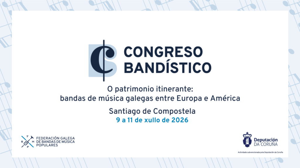 «El patrimonio itinerante: bandas de música gallegas entre Europa y América»es el título escogido para el congreso internacional planeado por el Grupo Organistrum y la Federación Gallega de Bandas de Música Populares. Este evento, que se desarrollará entre el 9 y 11 de julio, tendrá lugar en el iHUS (Universidad de Santiago de Compostela) y la Ciudad de la Cultura. Acaba de publicarse la llamada a comunicaciones, convocando a la comunidad académica y musical para enviar propuestas antes del 31/03/2026. Varios investigadores vinculados a Organistrum forman parte de este congreso: Montserrat Capelán Fernández y Javier Gándara Feijóo se encargan de la co-dirección; Álvaro Rodríguez Carballo, Sergio Rodríguez Gutiérrez y Efrén Soto López integran (junto con cinco personas más) el comité organizador, e Ilduara Vicente Franqueira se ocupa de la secretaría. Por su parte, el comité científico está conformado por ocho reconocidos expertos en el ámbito bandístico, cuyas instituciones son el Consello da Cultura Galega, Conservatorio Superior de Música de Vigo, ESMAE-Instituto Politécnico do Porto, Centro Superior de Investigaciones Científicas, Universidad Autónoma de Madrid, Universidad de Jaén y Xunta de Galicia. Para más información, puede consultarse el enlace inferior o el PDF adjunto.